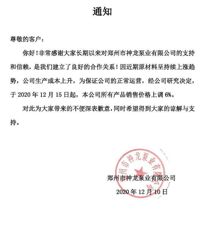 本公司所有产品于2020年12月15日起销售价格上调6%